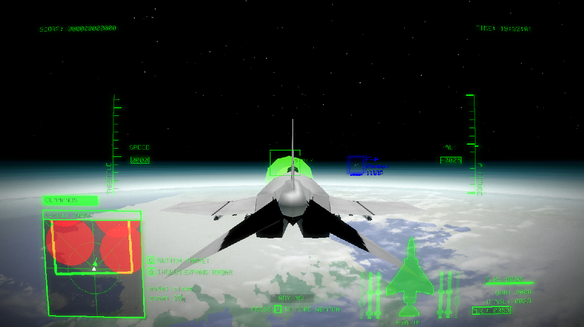 You fly around in a fighter jet (will be more planes, for now just a standard F-4) modified to fly in space and shoot up other planes and targets